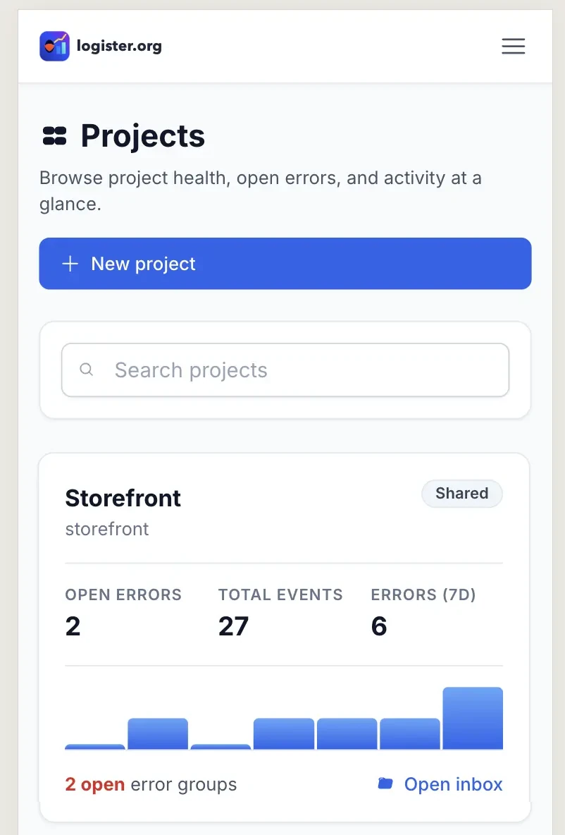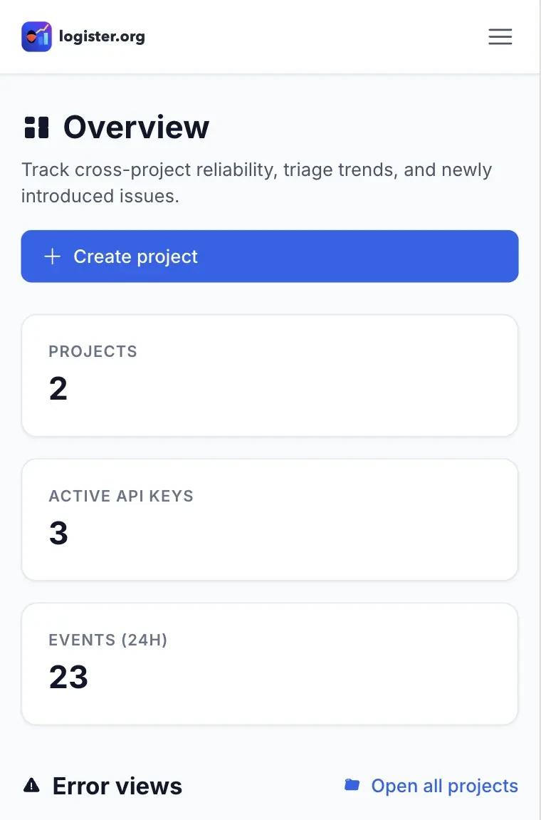 Capture errors, transactions, logs, and check-ins in one place. Logister gives your team a clean inbox for fast triage and clear release confidence.